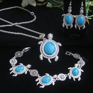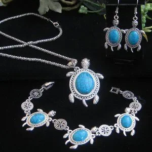 Turtle Pendant Necklace, Bracelet & Earrings faux turquoise silvertone setting