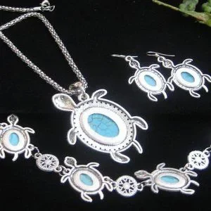 Adorable turtle pendant Necklace, Bracelet and hook Earrings set...Turtle's shell is faux turquoise acrylic..silvertone setting...Pendant is 2 1/4" with a 20" silvertone chain...Bracelet is 7 1/2" to 8" with a fold over clasp..Dangle earrings are 2"..If you love turtle jewelry this set will fit the bill...lightweight...You will love them...