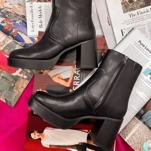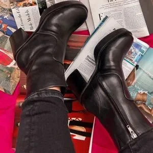 Evelia has wide feet, wears thin boot socks. She’s a size 8.5 in boots & is wearing a size 8.5. **If planning on wearing thick socks, size up half a size.