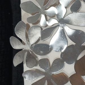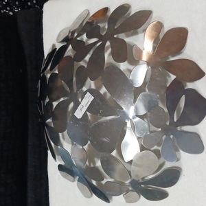 Pre-loved condition floral stainless steel bowls for use as an accent piece for any room in your home, office or celebration. The stainless steel gives these bowls extra stability and durability. Great decor piece that looks luxurious and expensive with zero assembly. Very versatile and I once nailed the bowls on my own kitchen wall. Handwash with damp cloth. Normal wear on bowls see pics but overall a great accent piece. 3 3/4" height 16 1/2" diameter.