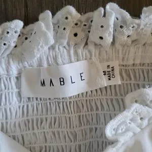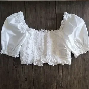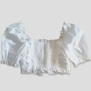 NWOT - MABLE Country Nights Cropped Lace Up Peasant Blouse - White. Features Short Crop, Adjustable Lace Up Ruched Chest, Off the Shoulder, Elbow Length with Slight Balloon Sleeve, Elastic Cuff, Eyelet Hem Detail, Slightly Stretchy Scrunch Back.