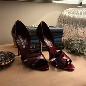 Open toe deep red Manolo Blahnik heels. Only signs of wear are at the bottom (see pictures), Size 35 1/2, they have been sitting in the closet forever, Neimen Marcus sticker is still partially on the bottom. Approx. 4” heel height