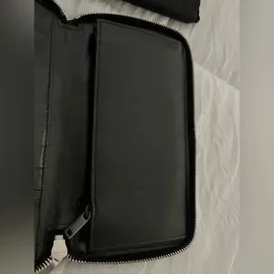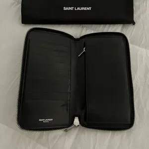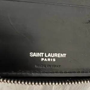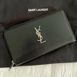 Authentic Preloved YSL continental, zip around wallet/clutch. Beautiful smooth black leather with silver hardware. There are 2 listings for this. Please see both listings because the photos are the best description. (In the last pic I’m pointing to an indention that was made when the zipper closed on the wallet) The other listing has more photos of the outside.