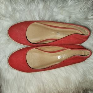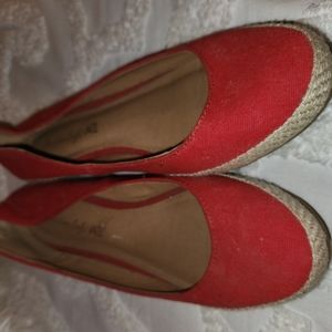 Red Linen, very low wedges! Very cute, in great condition. Leans toward narrow fit, not wide, a tad small for a size 10, 9.5 may be more accurate. American Eagle brand.