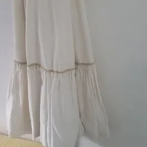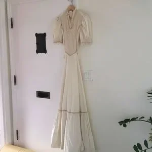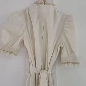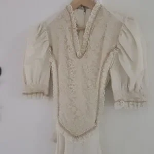 beautifully hand crafted, vintage Gunne Sax look alike. the material is a heavy high count cotton, lace detail. looks exactly like a Gunne Sax and is in excellent condition. I can provide measurements upon request please be specific what you would like measured. Zipper back with waist tie. Would work best for an xs/small. Bought this from an estate sale and sadly my post partum waist no longer fits in it.