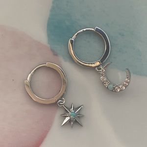 NEW, 925 Sterling Silver rhodium plated (rhodium is part of the platinum family and extremely durable and scratch & corrosion resistant). Huggie earrings are made to hug your ear and are purposely crafted to be small & dainty. Star & moon drop earrings with simulated diamond stones and a delicately placed opal right in the center. Simple yet says so much. Wear one on each ear or both on one side. Understated, dainty, simple, bohemian, festival, beach casual, breezy cool girl minimalist, decorative yet no frills. 9mm or .354in long, 1.8g weight. All jewelry pieces are specially picked by me and are only styles I would wear myself. No smoking, no pets home.
