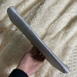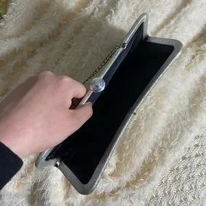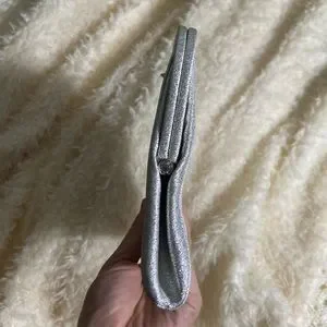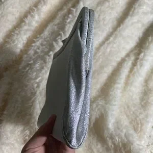 A small clutch in a beautiful shimmery metallic silver color. There is a very slight yellow stain that runs across the lower half of the bag, no visible unless looked at closely, photographed in the last photo.