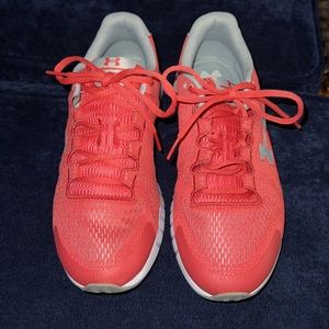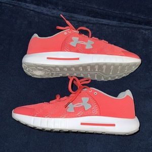 Womens Under Armour “UA micro G Pursuit BP” shoes size 9.5 The color is a mix between a hot pink and salmon. I wore them once so they’re basically like new. Just trying to clear some space in my closet!