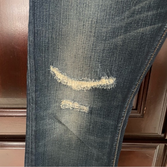 Factory distressing throughout, including on pockets, on knees/legs (holes that are sewn shut in factory) and in front of jeans near crotch as pictured. Some slight wear on back of hems as pictured and the leather patch has some superficial scratches, otherwise beautiful condition. First picture is a stock picture, factory distressing pattern differs slightly but it's the same model of jeans. With this model of Thin Finn, each pair is slightly unique.