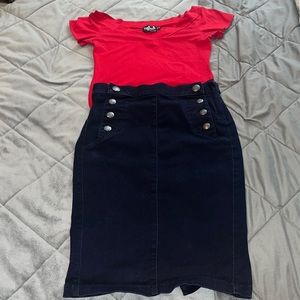 This dark denim beauty has tons of stretch and is so flattering . In like new condition only worn once . Shirt not included but listed