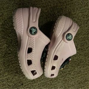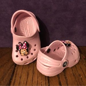 Light pink with Minnie mouse shoe charm on each shoe. Size 3