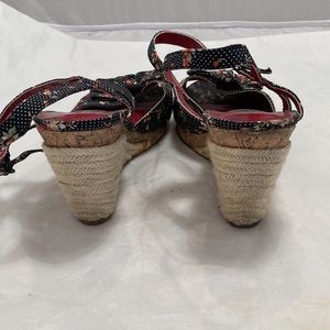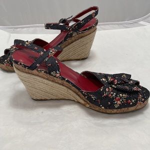 Floral fabric upper with adjustable silver buckle. Self fabric bow at toe. Raffia wrapped wedge heel at approx. 3 1/2" with 1/2" cork platform. Cushioned insole. Size 9M. Gently worn with minimal wear. Does not include box.