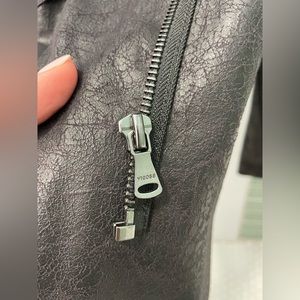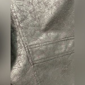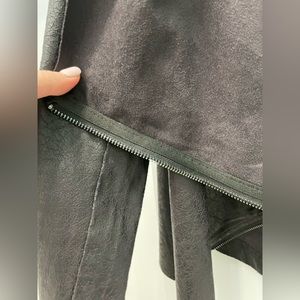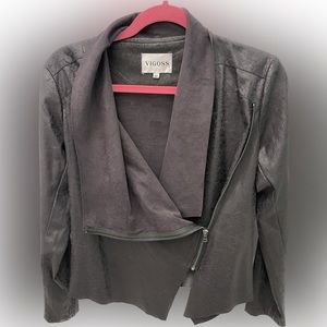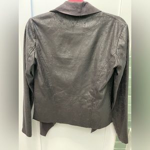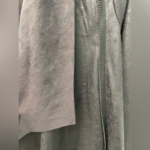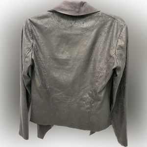 Drapey suede/faux leather jacket. Super soft! Inside feels like suede and the outside is a textured faux leather feel. Lightweight, not stiff at all. Silver hardware.