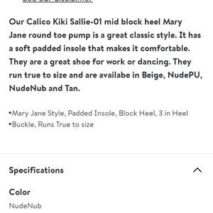 Calico KiKi size 10 Mary Jane mid block heel in nude. Heel inch height starts at 3 inches, and at the highest point in the back, they're a little over 3 inches. They sent me the wrong size, and its too much to return, so here we are, lol. Specifications are in photos and last two photos show the heel