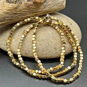 This Beaded Stack Bracelet Set comes with three separate gold stretch bracelets. You can wear the bracelets individually or stack them. Each bracelet has tiny square gold beads. These bracelets are lightweight and comfortable to wear.