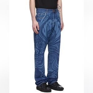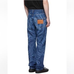 Wide-leg denim jeans in navy featuring graphic and logo woven in blue at front and back.