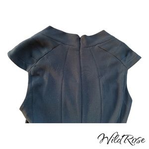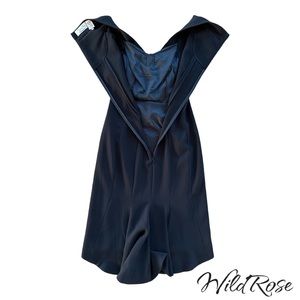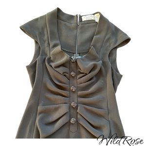 Absolutely stunning and one of a kind little black dress by Byron Lars. The details on this dress are tremendous - Sweetheart neckline with peek-a-boo leather insert. Ruching at bodice with knotted embellishments. Nipped in at the waist. Slightly off the shoulder sleeves. Darts at the back. Hemline is longer at back and gathers in a fishtail. Perfect for a cocktail lounge or date night.