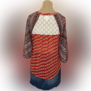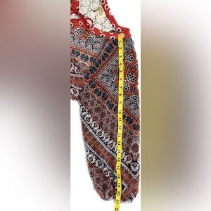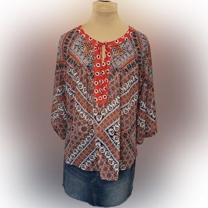 Features tie front, billowed sleeves and lace back. Paisley and floral print. Light weight and flowy! In excellent condition.