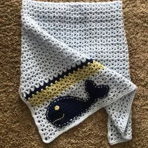 Hand made afghan/baby blanket. Blues and greens. With a whale on the bottom.