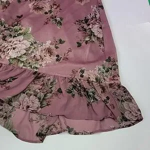 This chiffon dress features an allover floral print, surplice neck, and a midi length.