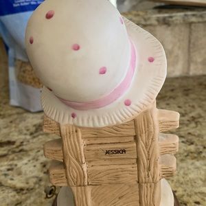 Porcelain child with bunny sitting on bench musical plays “It’s a small world”.