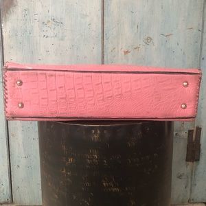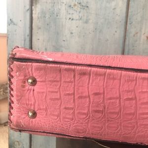 This may be my favorite bag of all time. It certainly is the most well made and designed bag a woman could ever want and has every little detail imaginable along with some I never even thought of! Juan Antonio makes the finest of leather goods and everything is done by hand. Juan is from Guadalajara, Mexico but now lives in San Diego, CA so everything is made in the USA. His attention is to not just designing gorgeous, quality products, but also functionally extraordinary products. The strap drop on this bag is perfect in order to carry it as a shoulder bag if you like. The interior is black leather and is divided into two sections by a large zippered center pocket. On one side there is another zippered pocket; and, on the other side there is a pocket for business or credit cards (3 slots), an open smaller pocket, and a built-in key holder. Every side of the bag is whip-stitched in matching leather. I’ve tried to show everything in the photos. Did I mention that it’s the prettiest shade of pink ever? This bag has been lovingly cared for & I hate parting with her. But I must divest myself of some of the many bags I own or my husband might divest himself of me!!! The dimensions are: 15” across; 9” tall; 4” width/bottom, and 10-1/2” strap drop. It is the perfect size. There is one very small scratch on the bottom (since it’s on the bottom it is unnoticeable) shown in photo #8; otherwise, this bag is in fabulous condition. It will last you for a lifetime! Be “Juan of a kind!”