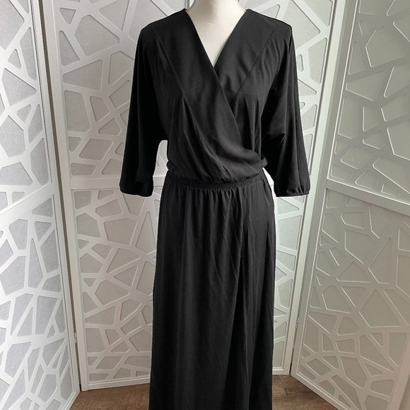 Garnet Hill Batwing Faux Wrap Knit Midi Dress Black Sz M Medium