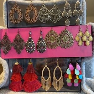 Switch up your earrings with these 10 pair of dangle earrings that are lightweight. Gently used. They range from 2” to about 3 1/2” long. Ask if you want more photos!I have no idea of original price of these, but I know I averaged more than $10/pair.