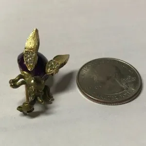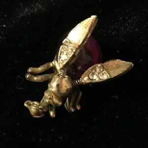 Very cute pin for bug fans, wings wiggle as they are mounted on springs, purple glass body, little stones set on wings, overall length is 27 mm, pin on back works good
