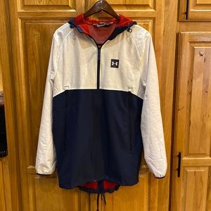 Under armour full zip up hooded windbreaker. Adjustable hood and back closure (see pics) lightweight well made feel. In great condition with lots of life left.