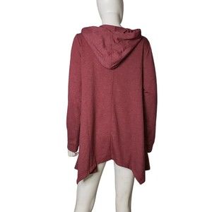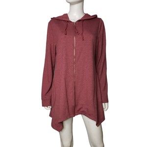 Cinnamon Red Lightweight French Terry, Long Sleeves, Full Zip Front, Hooded with Drawstring Ties at Neck, Tunic Length with Shark Bite Hemline. Also Features Side Pockets