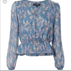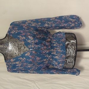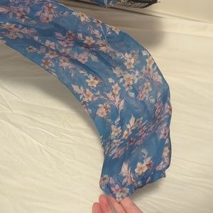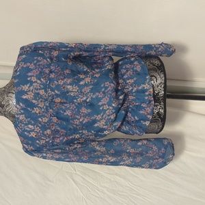 Intermix blue sheer 100% silk blouse with beautiful pink flowers. Covered buttons down front, balloon sleeve. Size large.