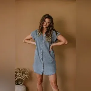 Brand new with tags!! Medium denim dress WITH POCKETS!! Hidden buttons going down the front. Cuffed sleeves. Thread and Supply brand. I’d say this runs slightly big. 100% cotton.