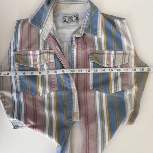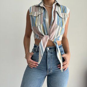 Cute reworked striped sleeveless denim shirt with tie front and chest pockets.