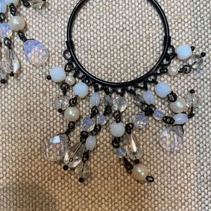 Fun fringe dangle hoop earrings made of milky-colored, moonstone, clear & pearl beads. Acrylic beads make these earrings lightweight. 1.5”W
