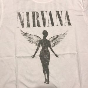 Vintage styled band tee ‘Nirvana’ with winged angel. Soft comfortable material with a little stretch.