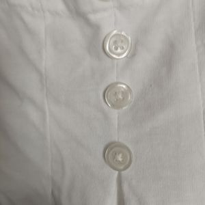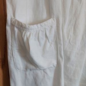 Women's White Baby Doll Style Blouse. NWOT. Open front pockets with gathered details. Button up neckline with white buttons. Pleaded front chest line. Crisp White Cotton 100%. Very soft, stretchable fabric. Very cute!