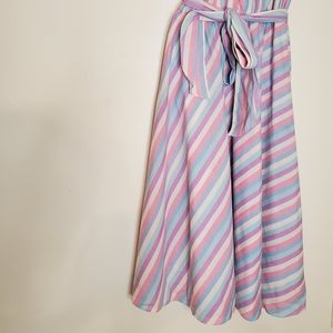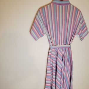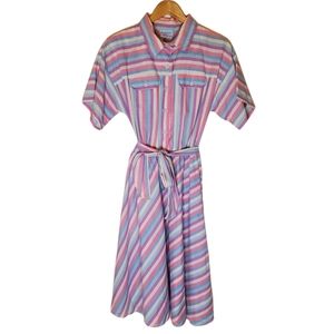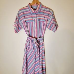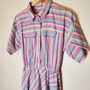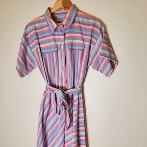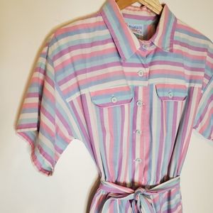 80s pastel shirt dress brings big vintage dreamy vibes. Dress is short sleeve with button-up top, collar, front pockets and waist tie and has angled stripes in pink, purple, blue and white tones. By Miss Joni Petite, 65% polyester, 35% cotton.