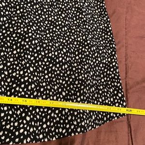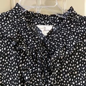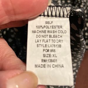 Women’s Pullover Sleeveless Blouse by Betsy’s Boutique Shop Brand, Size XL. See Measurements for Specifics on Size! Black Colored with Cream Color Designs, Ruffled Stand Up Collar, V-Neckline with Ruffles Trim and Tie Front and Rounded Hemline. 100% Polyester and Machine Washable! Dressy or Casual! Lovely Top! EUC!