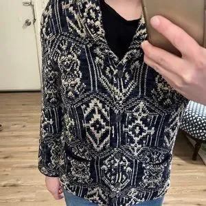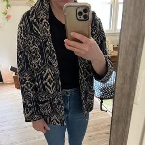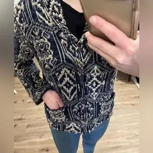 Denim & Supply Ralph Lauren blue, black, and tan patterned blazer. Casual. Size Large. NWT. Fun design! Fitted. Stretchy and comfy material. Thick material. Has front pockets.
