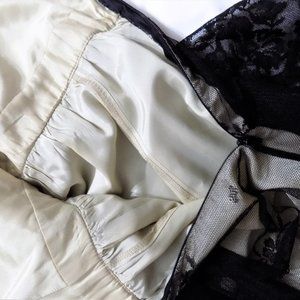 This is a Zara Basic midi dress in champagne with a black overlay that has a floral design. The dress is a US size medium. It has an empire waistline that is accented with a black ribbon that ties at the front. There is a side zip on the dress and it has spaghetti straps. It is approximately 36 1/2" in length down the middle to the hem and approximately 30" under the bust at the empire waist. The lining of the dress is 100% rayon and the outer layer is 100% polyester. This dress is in very good condition and has been kept in a smoke free home.