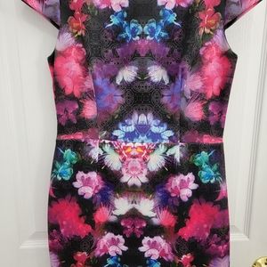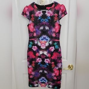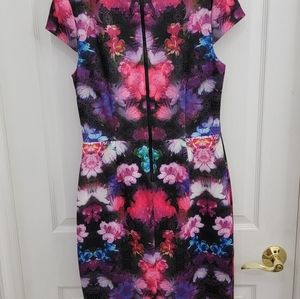 Betsey Johnson Floral short sleeve dress size 6. Very good condition. Slight peeling throughout. Zipper at back.