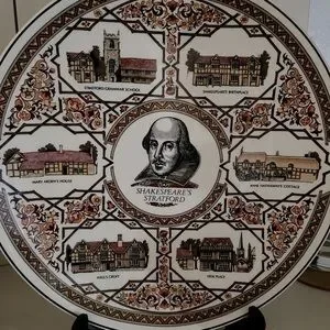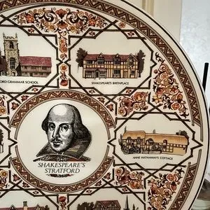 Stratford Plate - this plate depicts William Shakespeare, Mary Arden’s Home, his Birthplace in Henley Street, Stratford Grammer School, Anne Hathaway’s Cottage, New Place & Hall’s Croft. The plate is a Collectors Edition associated with The Shakespear Birthplace Trust.