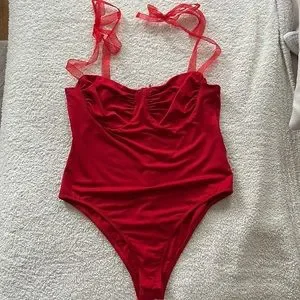 Red bodysuit with zipper back and clip enclosure on bodysuit. Cute ribbon detailing on straps.