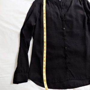 This is a black, size medium button down shirt. It has detail on the sleeves (see close up photo) and has only been worn once. The length from shoulder to hem is approximately 24 1/2" and around the bust it measures approximately 40". The shirt is 100% polyester and has been kept in a smoke free home.