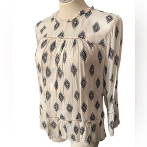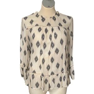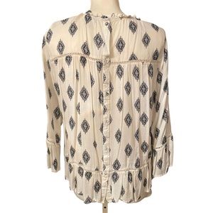 Lucky Brand Women’s Blouse Button Down Back 3/4 Sleeve Beige and Black Pattern L