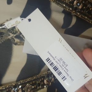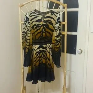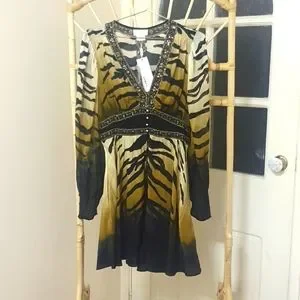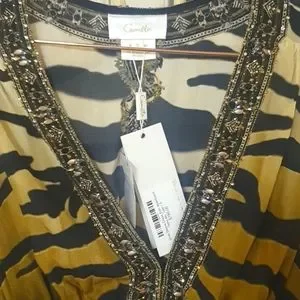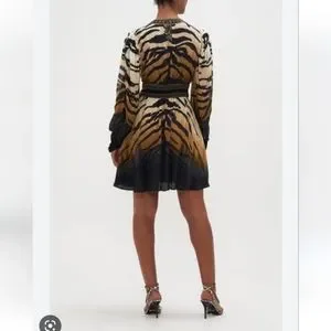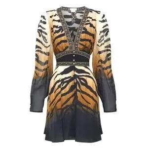 ๐ฏ The Tame My Tiger Drop Sleeve Dress With Waistband speaks to a mosaic of deep midnight hues adorning striking tiger stripes wrapped in soft creams and caramels. Complete with hand-embellished CAMILLA crystals, this luxury silk dress is home to statement puff sleeves, a deep v neckline that cascades into a defined waistline and a relaxed silhouette that falls into a cropped hemline.