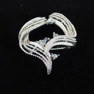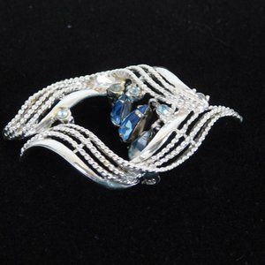 Blue Clear Rhinestones Ribbon Shape Coro Signed Brooch Pin Silver Tone Vintage