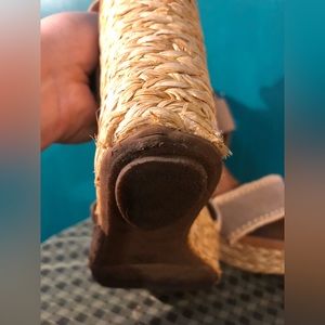 Perfect for spring and summer, tang and cream sandals with stretchy material for comfort and a straw wedge heel for style. There is some wear on the back and bottoms of shoes(see photos)other than this they are in great condition!