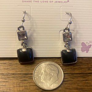 ~Silver plated drop earrings with clear square cut crystal accents and a black glass cat's eye stone.